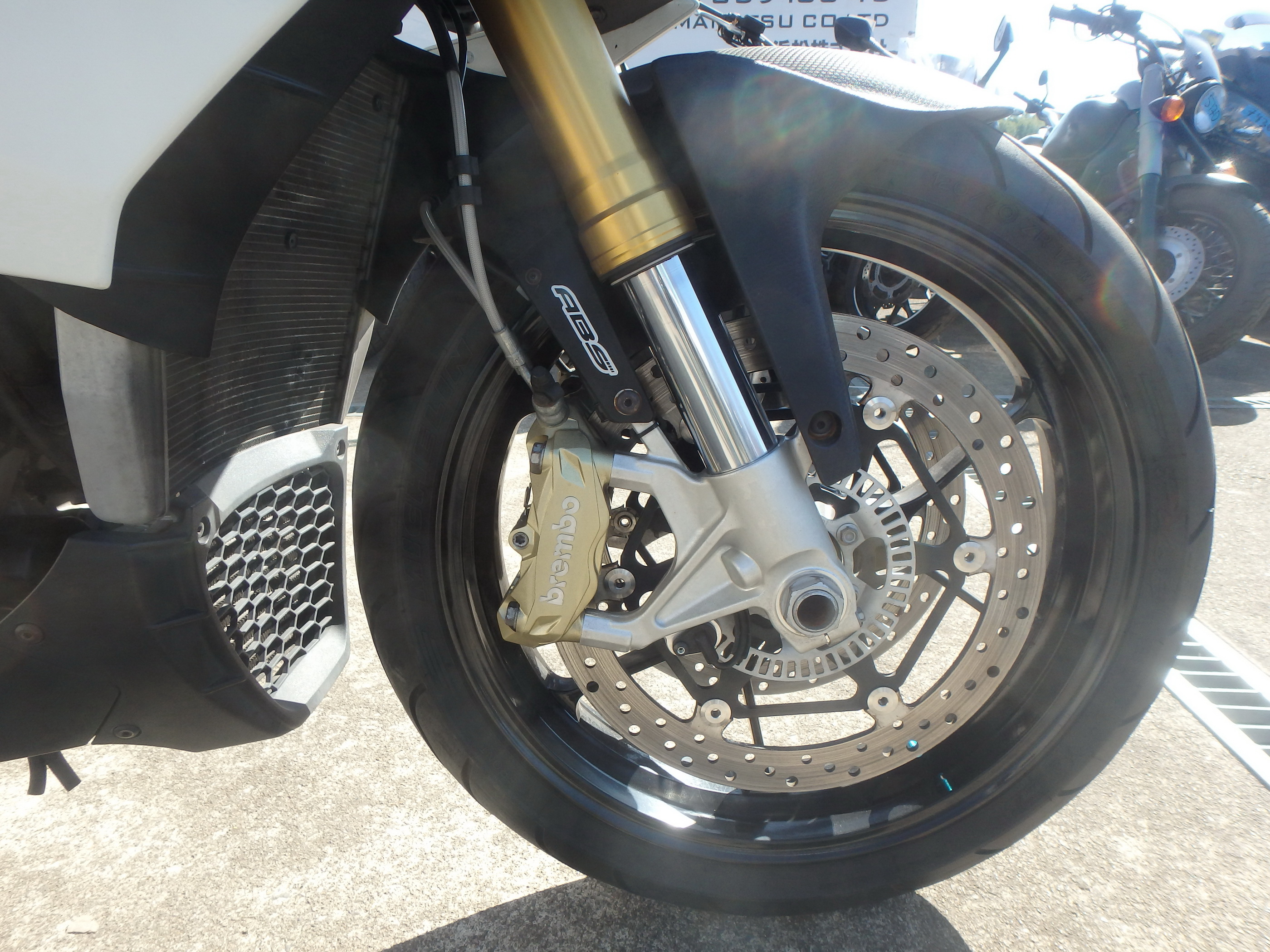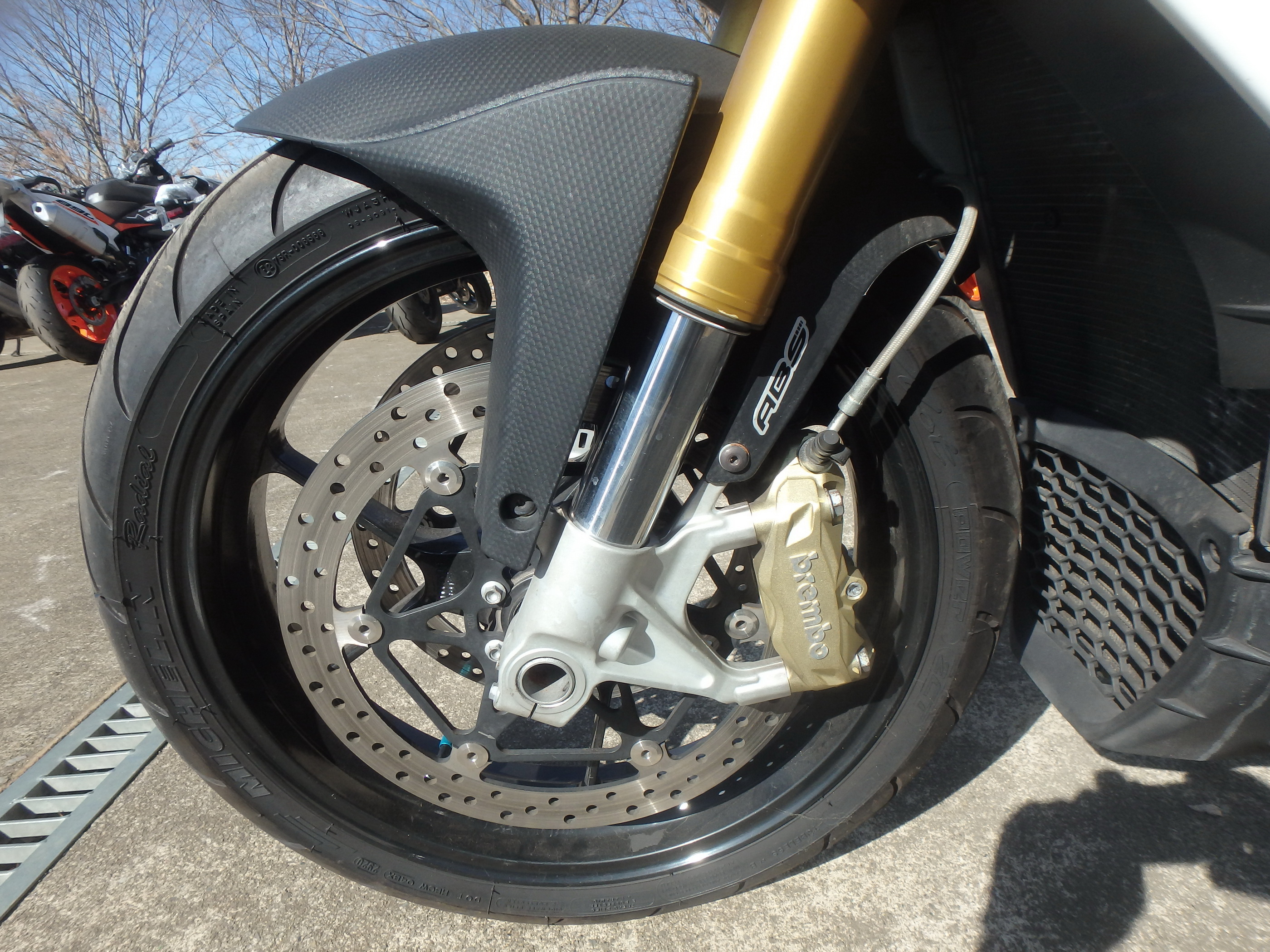 2 x Ø320 mm floating stainless steel discs with lightweight stainless steel rotor with 6 studs. Brembo monobloc radial callipers M432 with 4 horizontally opposed Ø32 mm pistons. Sintered pads. Axial pump master cylinder and metal braided brake hoses.